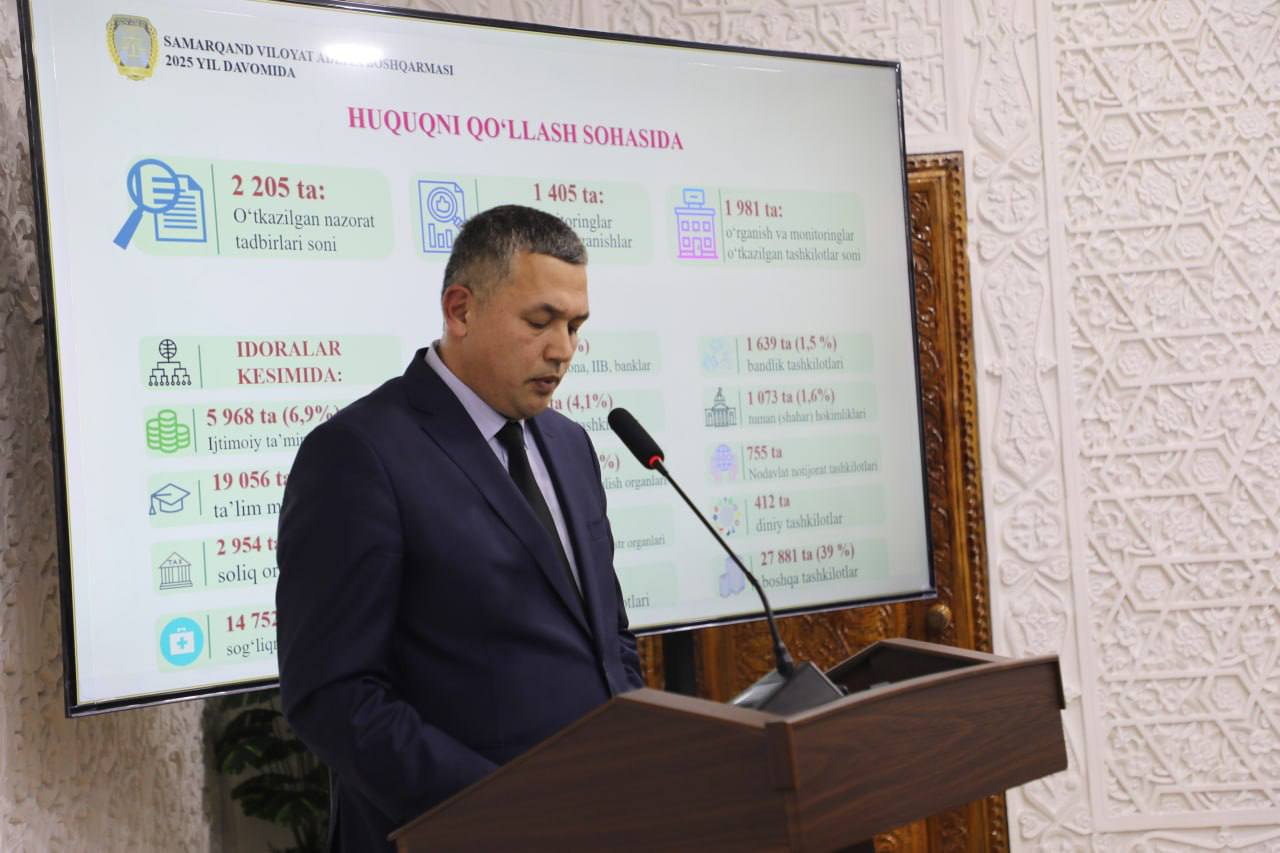 Unda, xususan, norma ijodkorligi hamda huquqni qo‘llash amaliyoti holati, huquqiy targ’ibot va ushbu yo‘nalishlarda amalga oshirilgan ishlar, erishilgan natijalar va mavjud muammolar atroflicha yoritib berildi. Shuningdek, qonunchilik hujjatlarini takomillashtirish, ularning joylarda to‘g‘ri va bir xil qo‘llanilishini ta’minlash borasida olib borilayotgan ishlar haqida ma’lumot berildi.